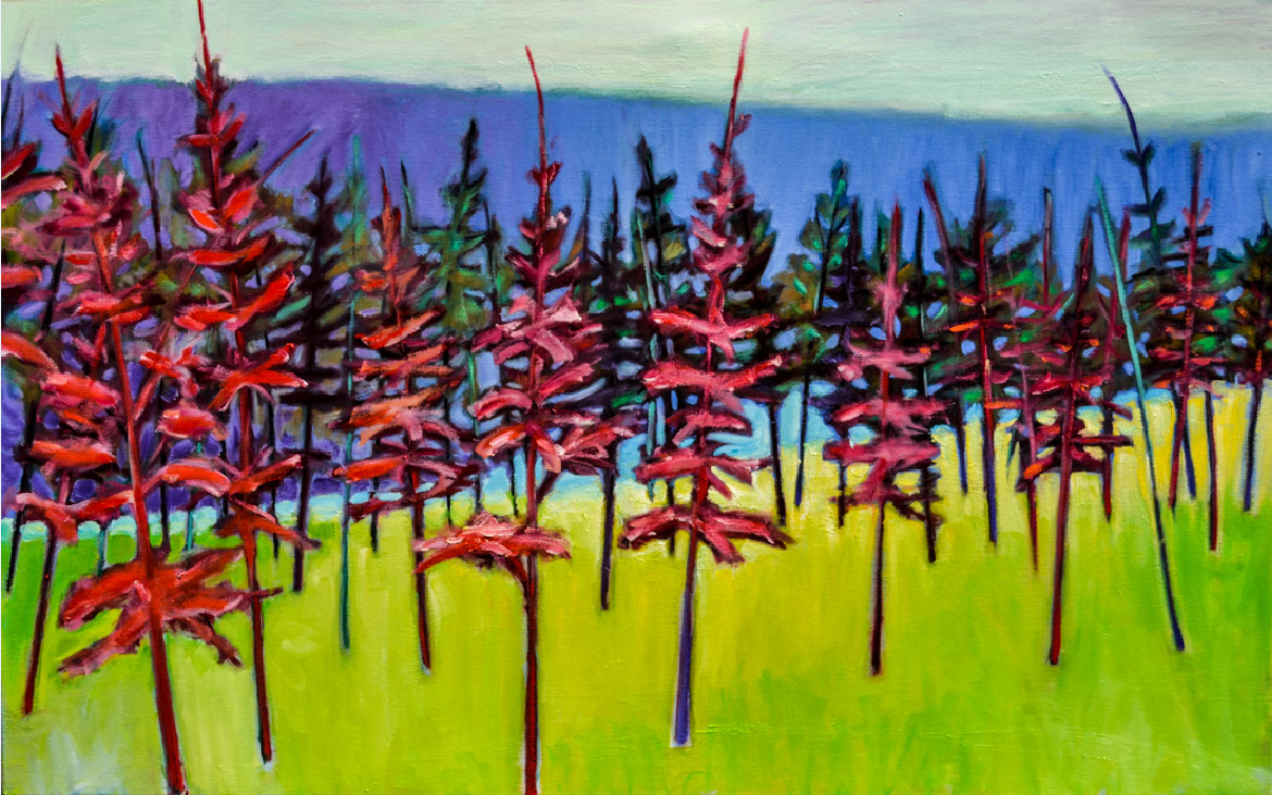Red trees on green oil on canvas 34 x 54